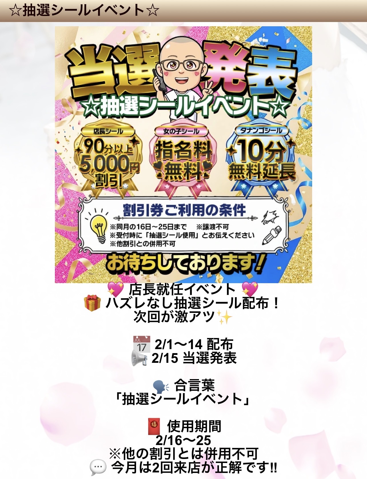 2/14までに配布されたシールについての件♪ 2026/02/15 12:21:03 女の子とお店をフォローします いいね! 抽選結果はこのように…🌟ちなみに私のシールはこんな感じでした୧( "̮ )୨✧︎2/16 〜 25までに使用可能なので、覚えててくれたら嬉しいです🌸 プラウディア☆さやか 2/5 新人対象 70分15,000円リピーター様対象 指名料ゼロ円#プラウディア公式LINE:@038ukvzr LINE予約可能。お得なクーポン発行中。※こちらから発信する事はありません。 女の子とお店をフォローします いいね! この日記をXに投稿する